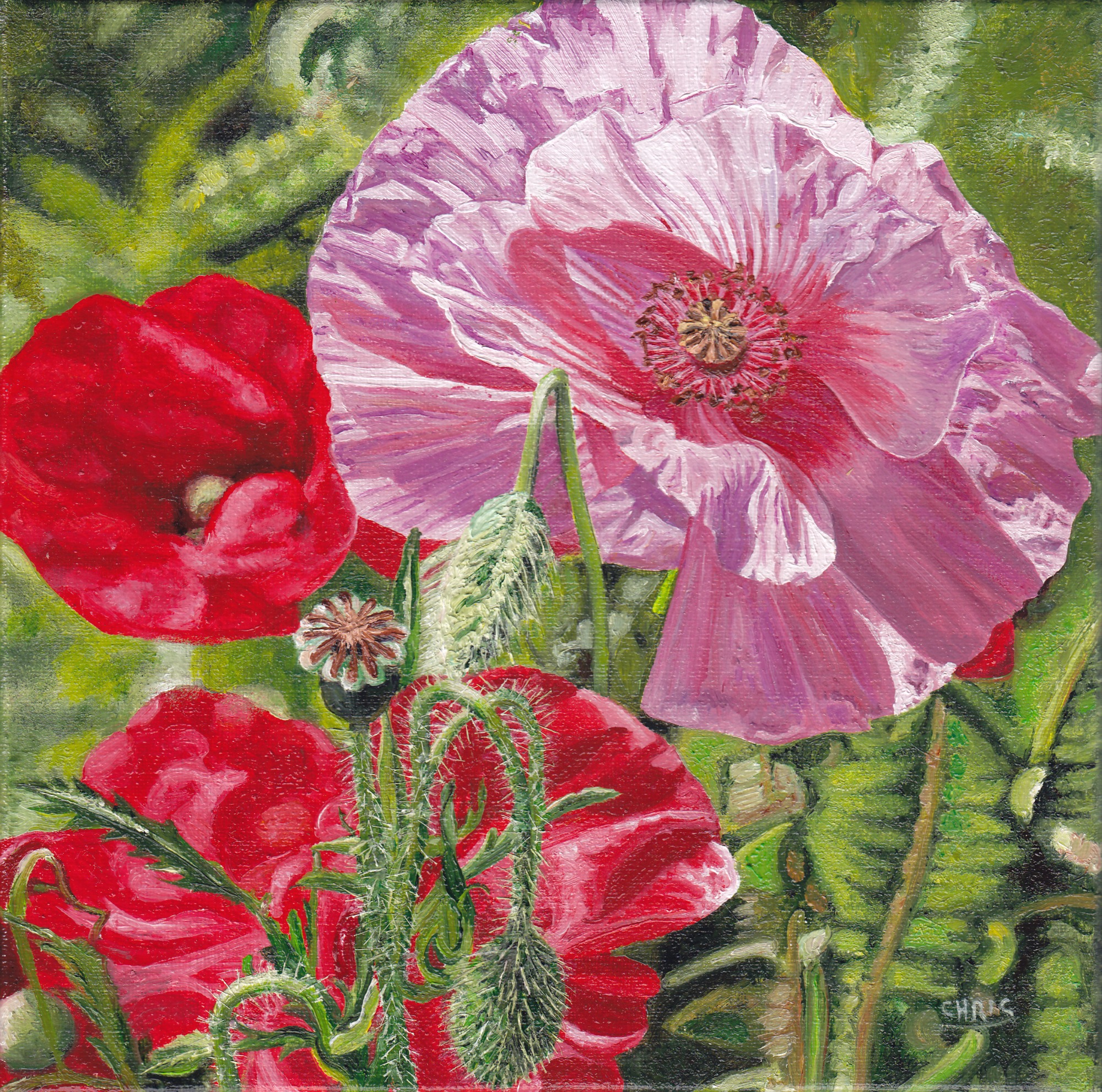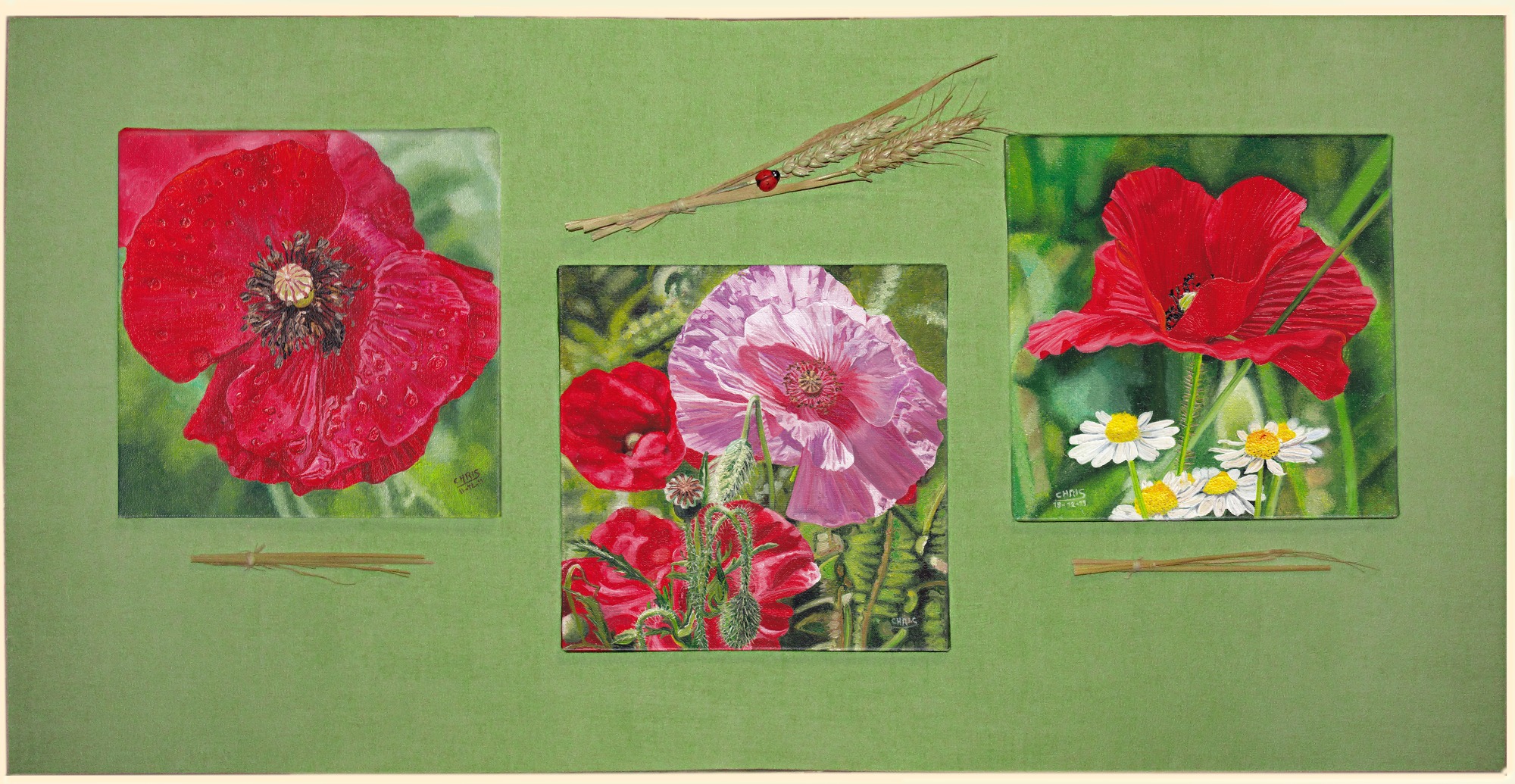 Orientée sur des formats plus petits, mais mis en scène à travers un tryptique, cette composition de 3 toiles présente des coquelicots.