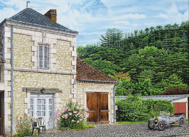Sur cette huile sur toile, les propriétaires ont demandé à l'artiste de la transposer dans le passé, en ajoutant un véhicule ancien sur des pavés.