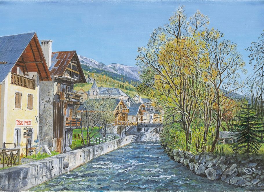 Cette huile représente une vue de Guisane, petite rivière qui coule dans les Hautes Alpes.
