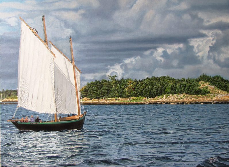 Cette nouvelle huile sur toile présente un voilier, dans le Golfe du Morbihan, tout près de l'Île aux Moines.